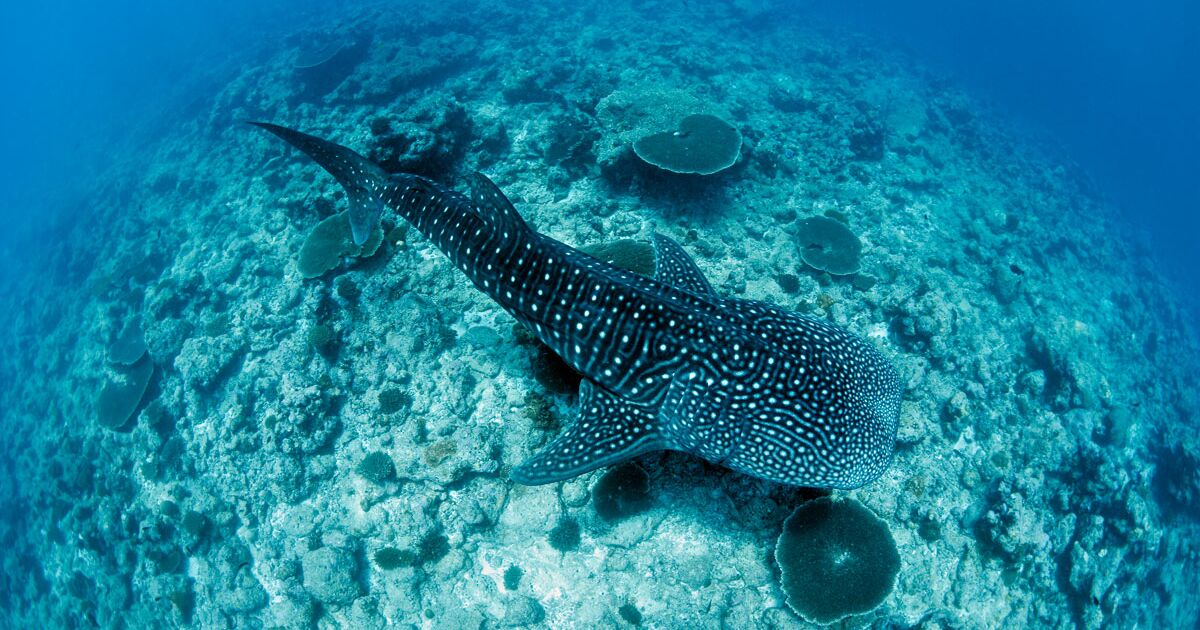 It’s morning, and we’re anticipating a bucket-list-topping dive day. The night before had felt like trying to fall asleep on Christmas Eve—one more sleep till whale sharks! Of course, you know you can’t guarantee any wild animal, much less one with such a range and depth of habitat, but we’ve heard the stories and seen the photos. We are ready. Even our cappuccinos are emblazoned with smiling whale sharks this morning, which we hope will not be the extent of our view of the critter. The goal is simple: We will search— along with every other boat in the region, it seems—along the known hotspot South Ari Atoll from first light. Breaking from the usual schedule, we’ll spend the whole morning on the boat and perhaps not even don a tank. If we’re lucky enough to spot the telltale spots and stripes of a “big big” through the crystal-clear water, the captain will try to position us in its path to hop in for a snorkel.